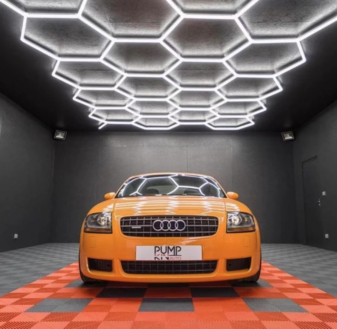 Una de esas tendencias que ha ganado gran popularidad es el uso de luces de garaje hexagonales.